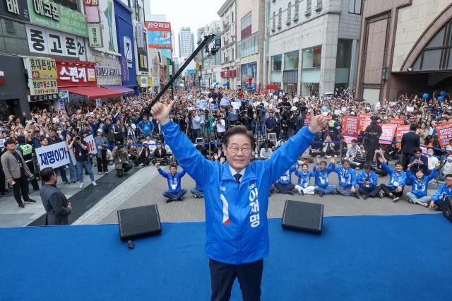 Lee Jae-myung, the Democratic Party candidate, began a series of rallies in Gumi, North Gyeongsang Province, before proceeding to Daegu, Pohang, and Ulsan.