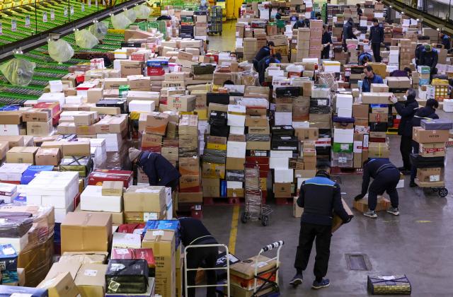 Workers sort parcel boxes at the Dongseoul Mail Logistics Center in Seoul’s Gwangjin Ward ahead of the Lunar New Year holiday on Feb. 11. 2026. AJP Yoo Na-hyun