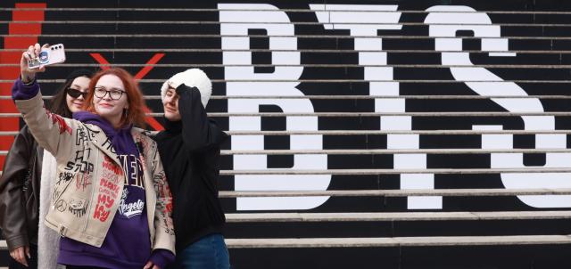 Russian tourists take photos March 11 on the steps of the Sejong Center for the Performing Arts in Seoul, posing in front of a promotional display for a BTS concert marking the group’s return as a full lineup. [Photo=Yonhap]