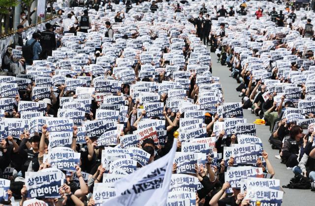 Samsung Electronics union joint struggle headquarters holds a rally calling for removal of the performance-bonus cap outside the company’s Pyeongtaek campus in Pyeongtaek, Gyeonggi Province, on the 23rd. [Photo=Samsung Electronics]