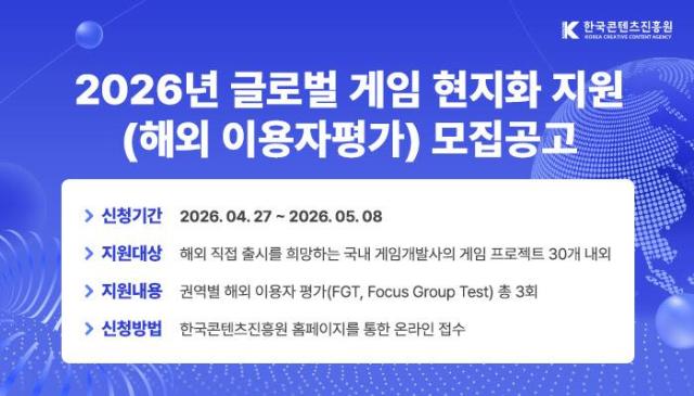 The Ministry of Culture, Sports and Tourism and the Korea Creative Content Agency said they will accept applications from April 27 to May 8 for projects to join the “2026 Global Game Localization Support (Overseas User Testing)” program.